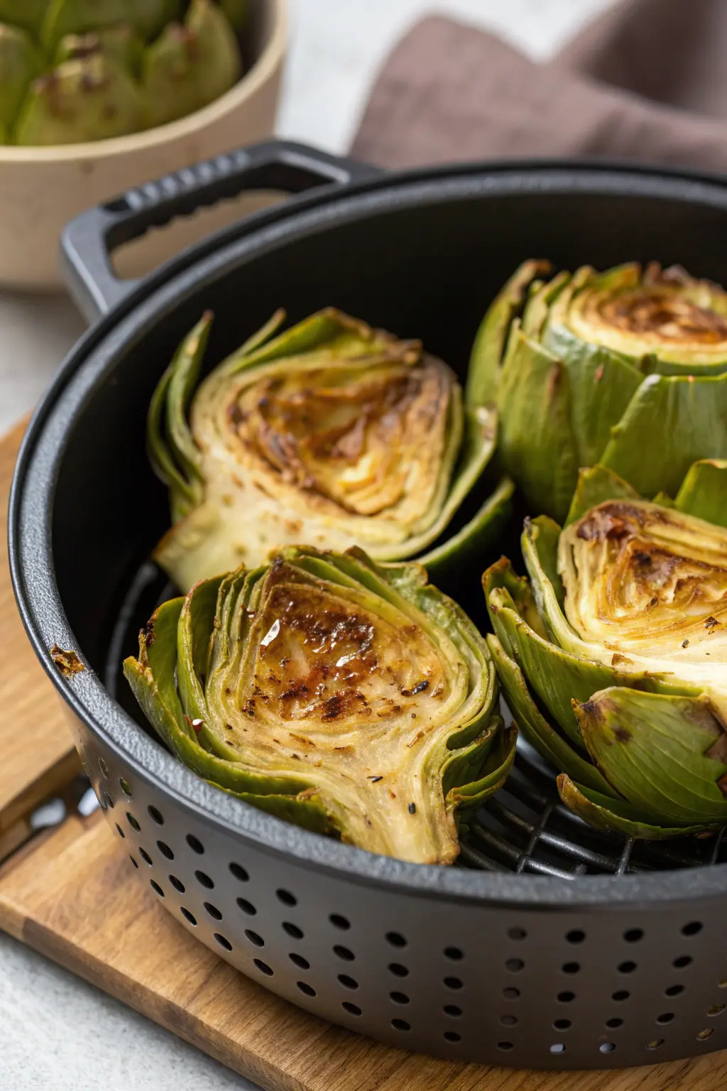5. Air fry: Place the artichokes in the air fryer basket, cut side up. Cook for 20 minutes, flipping halfway through. The aroma that fills your kitchen will have everyone asking what’s cooking. This also allows for even cooking and ensures both sides get crispy. If you’re cooking for more than two, you can easily double the recipe, just make sure not to overcrowd the air fryer.