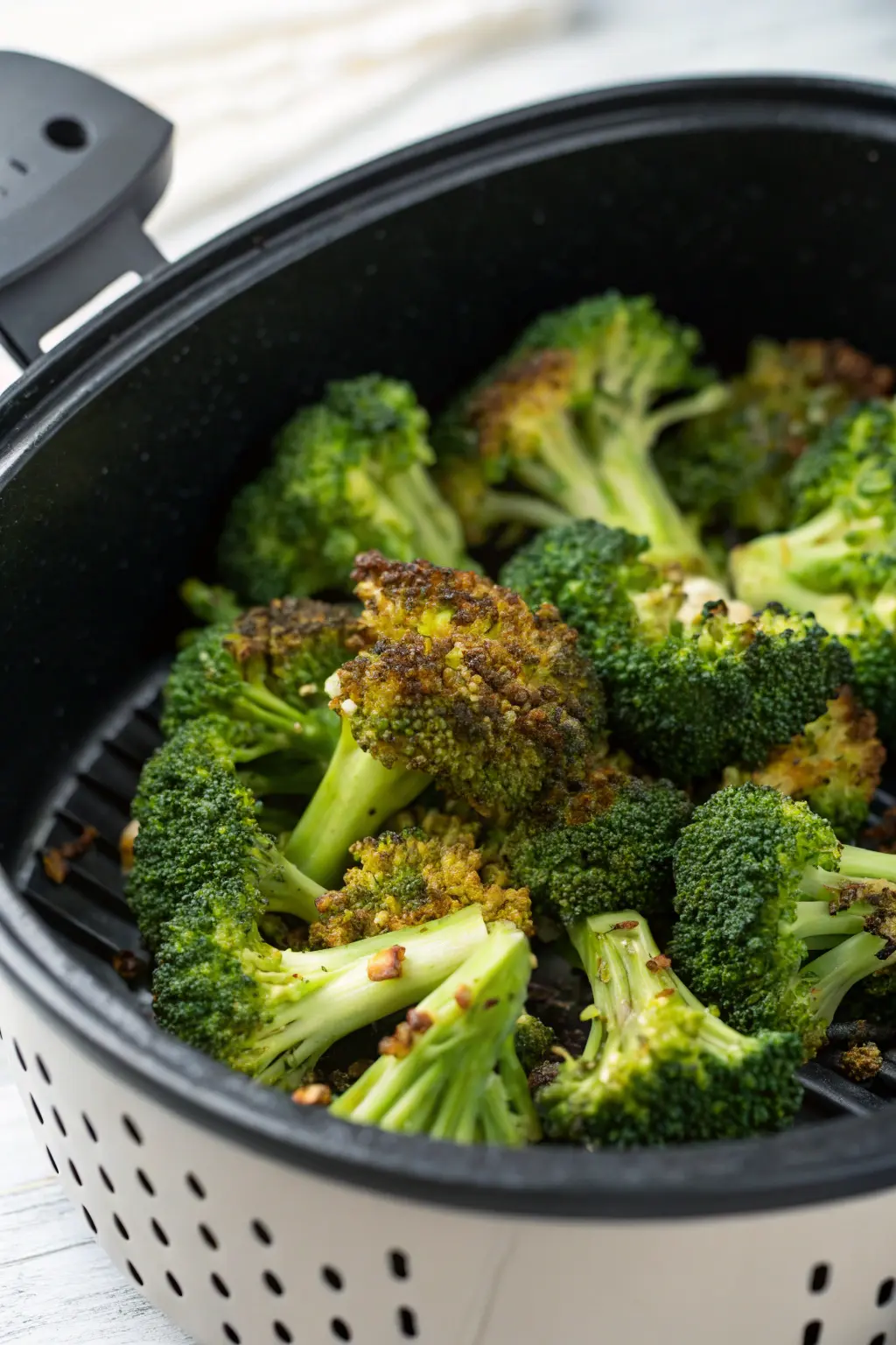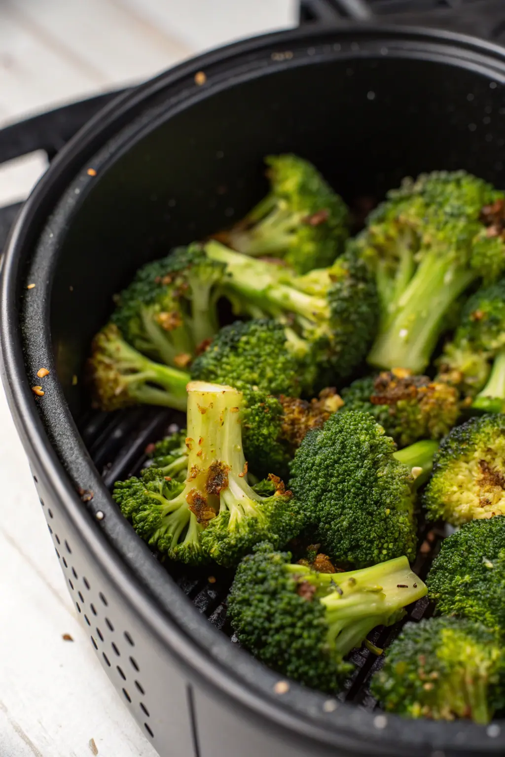 4. Air fry for 8-10 minutes, shaking the basket halfway through for even crisping, until the broccoli is tender and slightly crispy.