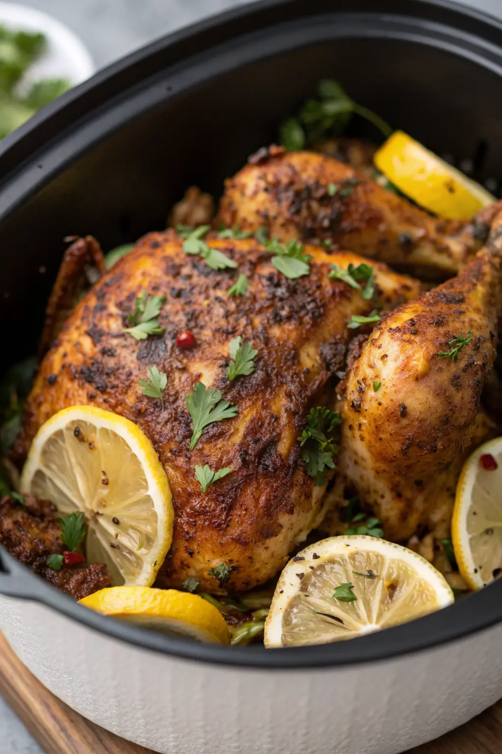 1. In a large bowl, mix olive oil, cumin, coriander, paprika, garlic powder, onion powder, salt, pepper, and lemon juice to create a marinade. The blend of spices and lemon juice creates a fragrant and flavorful base that permeates the chicken beautifully, ensuring a robust taste in every bite. 2. Add the chicken thighs to the bowl and coat them well with the marinade. Let them sit for 10 minutes. This resting period allows the flavors to penetrate the meat, ensuring every bite is delicious. If you have more time, consider marinating for up to 2 hours to deepen the flavors. 3. Preheat your air fryer to 375°F (190°C) for 5 minutes. Preheating ensures that the chicken starts cooking immediately, resulting in a crispy exterior and juicy interior. 4. Place the marinated chicken thighs in the air fryer basket in a single layer, ensuring they do not overlap. This promotes even cooking and prevents steaming, which is crucial for achieving that perfect crispiness. 5. Cook the chicken for 12 minutes, then flip them over and cook for an additional 10-13 minutes, or until the internal temperature reaches 165°F (75°C). Flipping the chicken ensures both sides get that irresistible golden crust, enhancing the visual appeal and texture. 6. Once cooked, let the chicken rest for 5 minutes before slicing. Resting allows the juices to redistribute within the meat, keeping it moist and flavorful. 7. Garnish with chopped parsley and serve. The parsley adds a fresh, vibrant finish to the dish, providing a nice contrast to the rich spices.