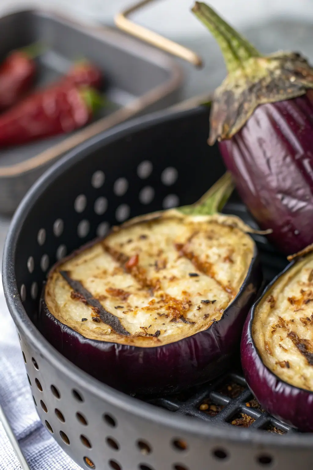 - Cook for 12-15 minutes, shaking the basket halfway through to ensure even cooking, until the eggplant is golden brown and tender.
