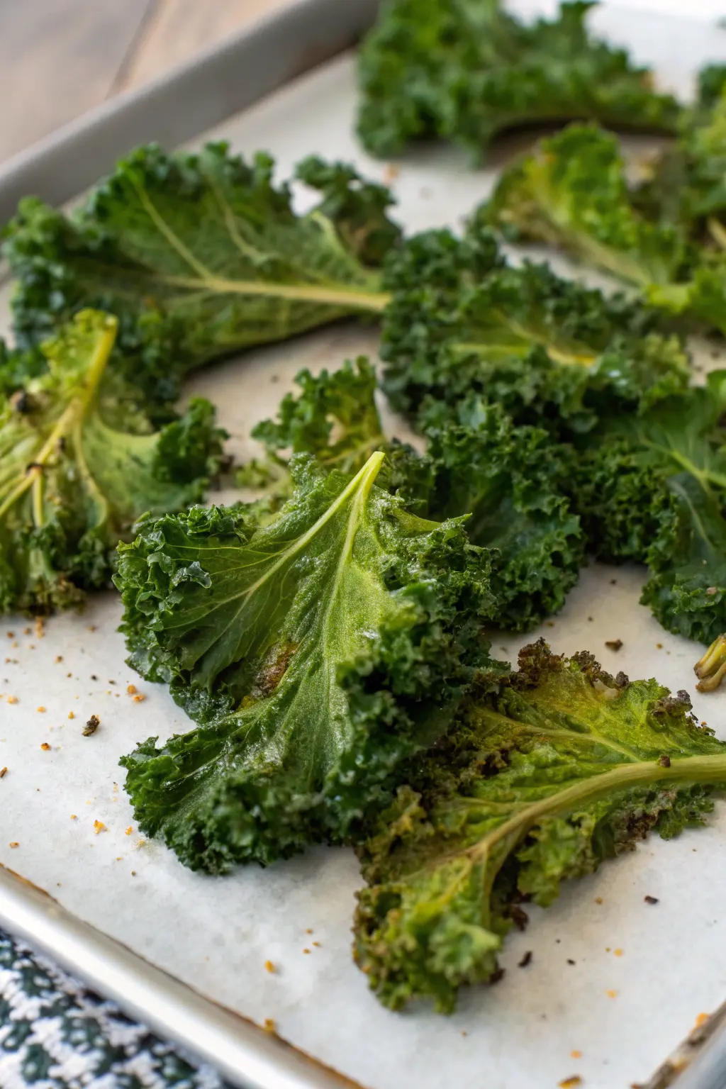 Helpful Tip: Make sure the kale leaves are completely dry before adding oil to ensure they become crispy. A salad spinner is perfect for this task, or you can pat them dry with a clean kitchen towel. Avoid using too much oil as it can make the chips greasy and less crispy.
