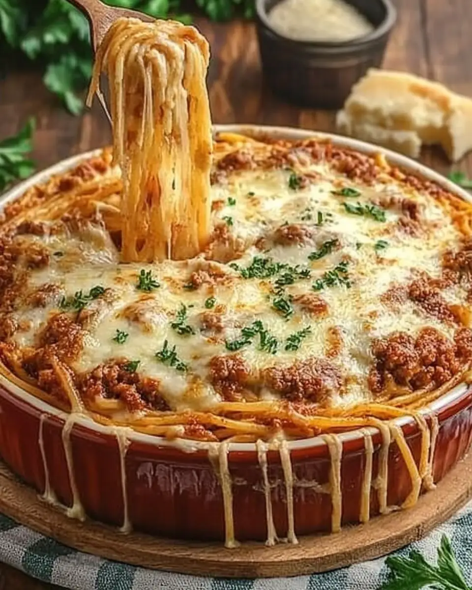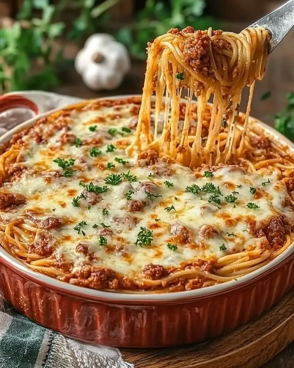Layer and Bake: In a greased 9×13-inch baking dish, layer half of the spaghetti mixture. Top with the meat sauce, then cover with the remaining spaghetti mixture. Sprinkle the remaining mozzarella cheese on top.