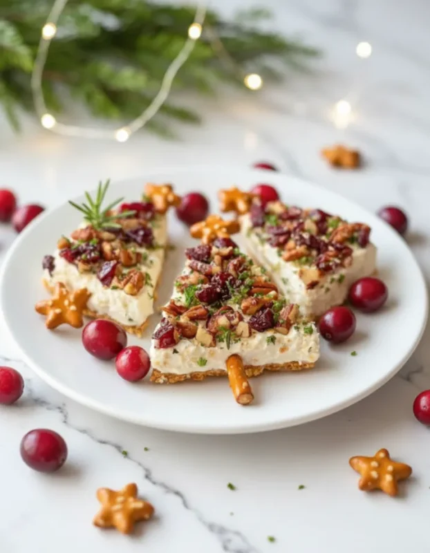 Creamy, savory herbed spread sits on a crisp cracker or toast, topped with fresh herbs and tiny pops of bright flavor from vegetables or cheese “ornaments.” Each bite is crunchy, creamy, and full of holiday cheer. They taste as festive as they look!