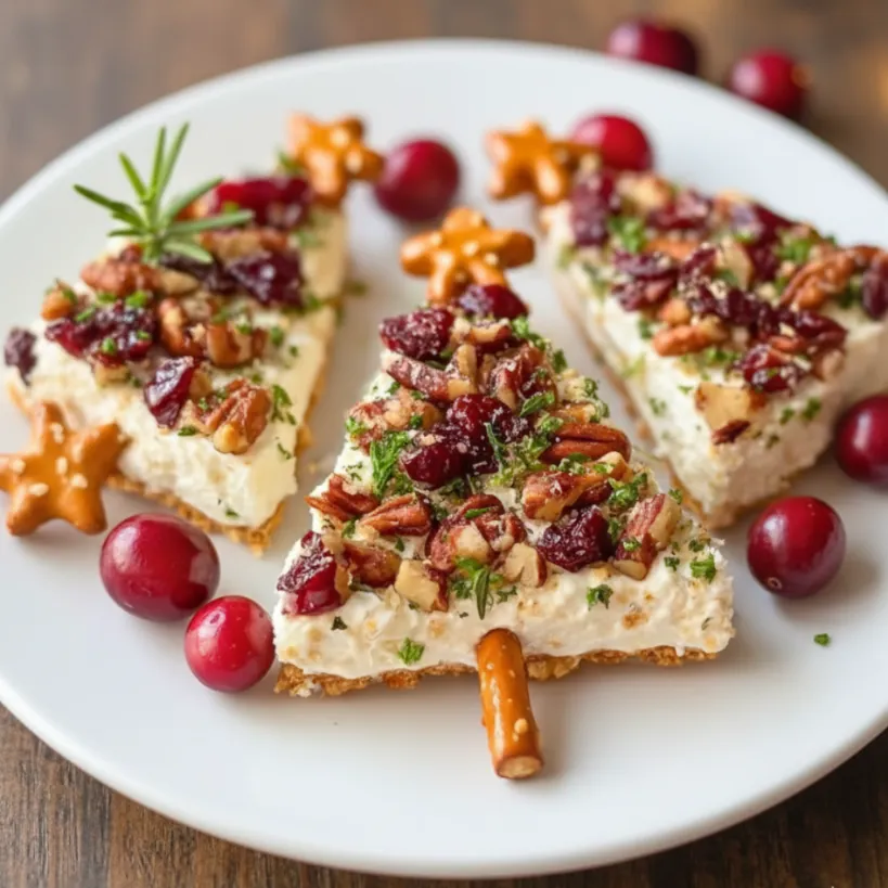 Creamy, savory herbed spread sits on a crisp cracker or toast, topped with fresh herbs and tiny pops of bright flavor from vegetables or cheese “ornaments.” Each bite is crunchy, creamy, and full of holiday cheer. They taste as festive as they look!