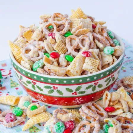 This treat gets its name honestly. The combination of salty pretzels, crunchy Bugles, Fritos, and roasted peanuts coated in sweet white chocolate is genuinely addictive. Add colorful M&Ms for festive flair, and you’ve got a snack mix that disappears faster than you can make it. The best part? It takes just 15 minutes to make and requires no baking whatsoever.