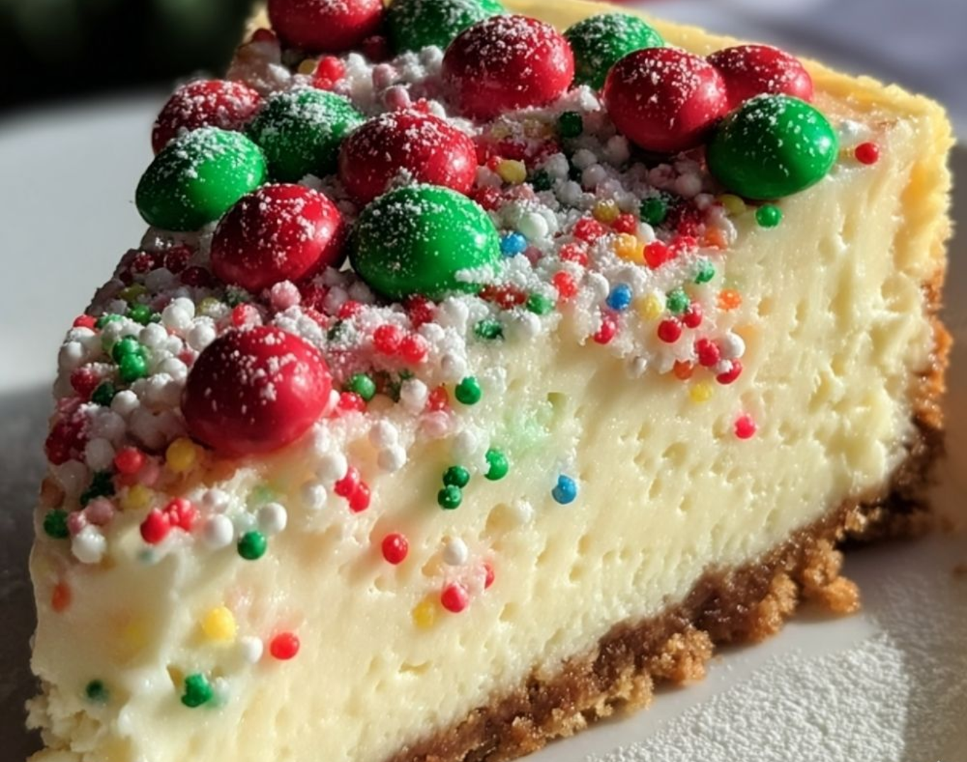 A rich, creamy, and festive dessert that combines the nostalgic flavor of holiday sugar cookies with smooth cheesecake, all topped with whipped cream, crushed cookies, and colorful sprinkles.