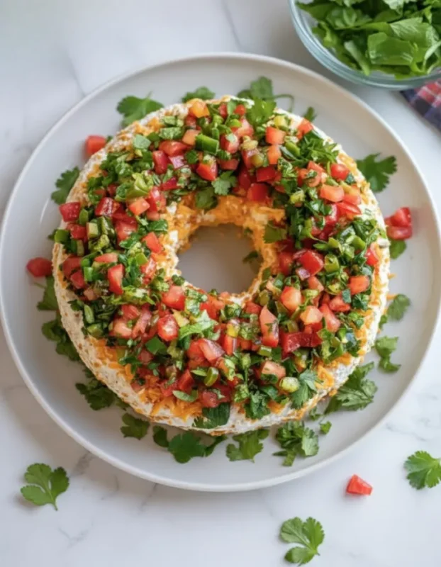 Stir in the green onions, bell peppers, jalapeños (if using), and crushed tortilla chips. - Shape your wreath