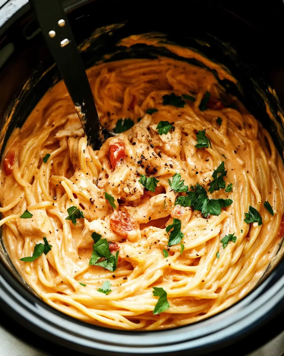 7. Combine Pasta and Sauce: Add the cooked spaghetti to the slow cooker, gently tossing to coat the pasta evenly with the creamy chicken sauce.