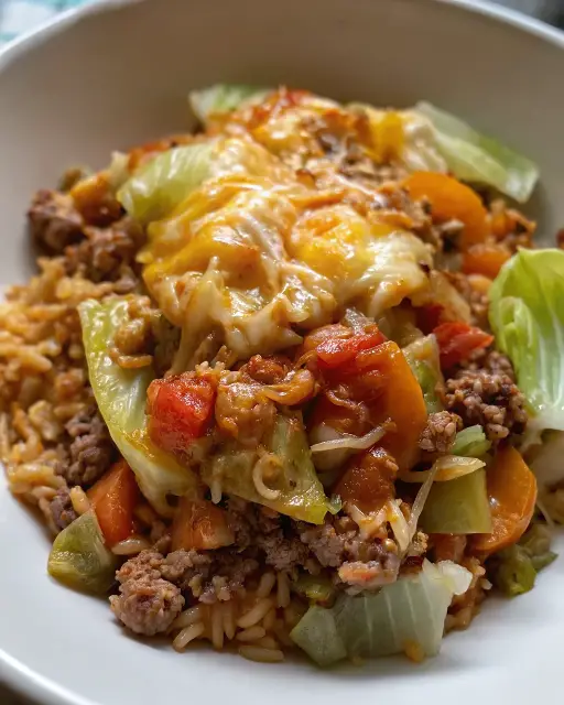 A hearty and comforting casserole made with tender cabbage, seasoned ground beef, rice, and a generous topping of melted cheddar cheese.