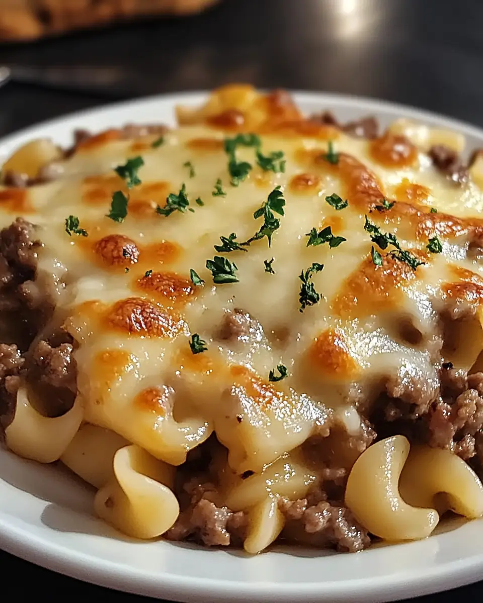 Tender egg noodles and savory ground beef come together in a rich, cheesy French onion–inspired sauce for the ultimate comfort meal.