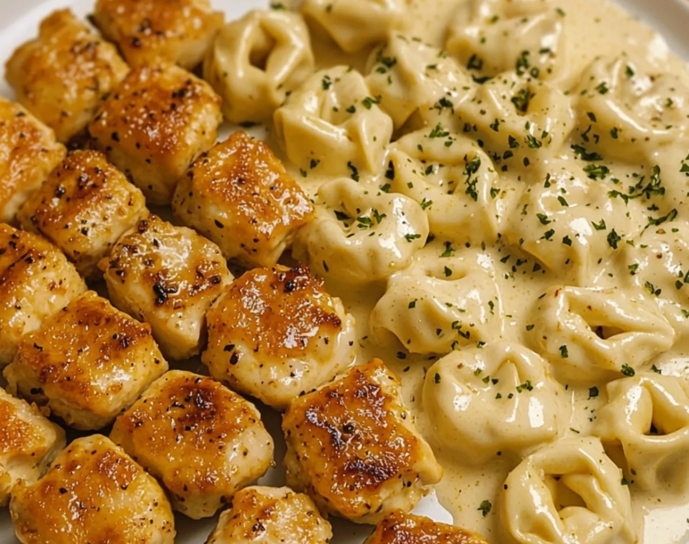 This dish is the ultimate comfort food combo: crisp-edged chicken bites pan-seared in garlicky butter, tossed with pillowy cheese tortellini and coated in a creamy Alfredo sauce. It’s one-skillet magic that feels fancy but is totally weeknight-friendly.