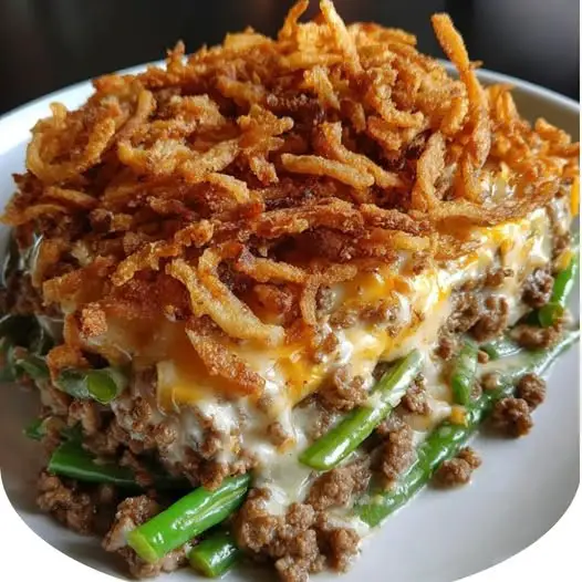 A hearty and comforting casserole featuring ground beef, green beans, and a creamy mushroom soup base, topped with melted cheese and crispy fried onions.