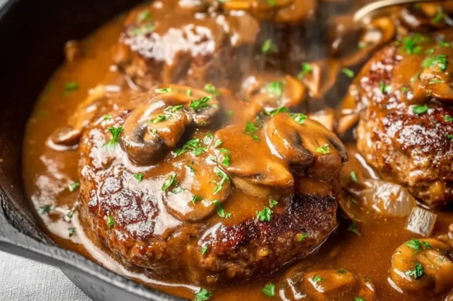 Remove from heat and garnish the hamburger steak with gravy with freshly chopped parsley for a burst of color and freshness. Serve this dish over mashed potatoes, rice, or with your favorite steamed vegetables like broccoli or green beans for a complete and satisfying meal.