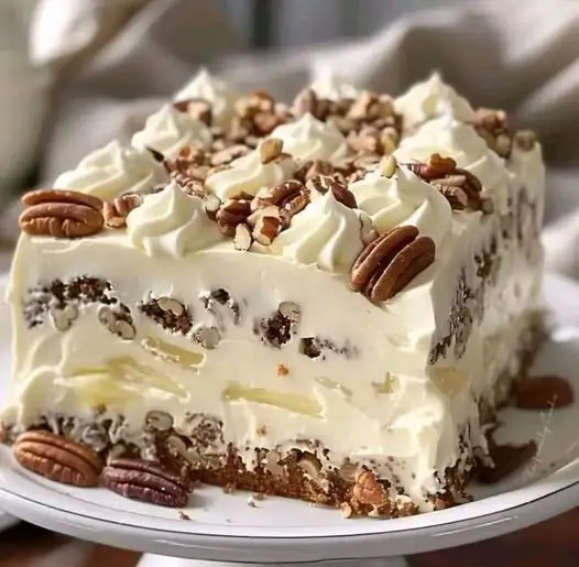 - Cream Cheese Frosting: In a large bowl, beat together the softened cream cheese and butter until smooth. Gradually add in the powdered sugar, remaining vanilla extract, and 2 cups of crushed pecans, mixing until well combined. Spread the frosting generously over the cooled cake.