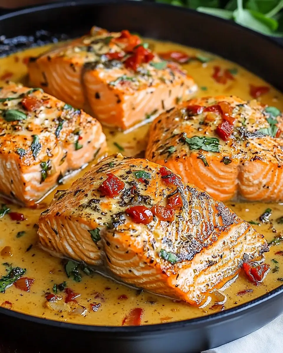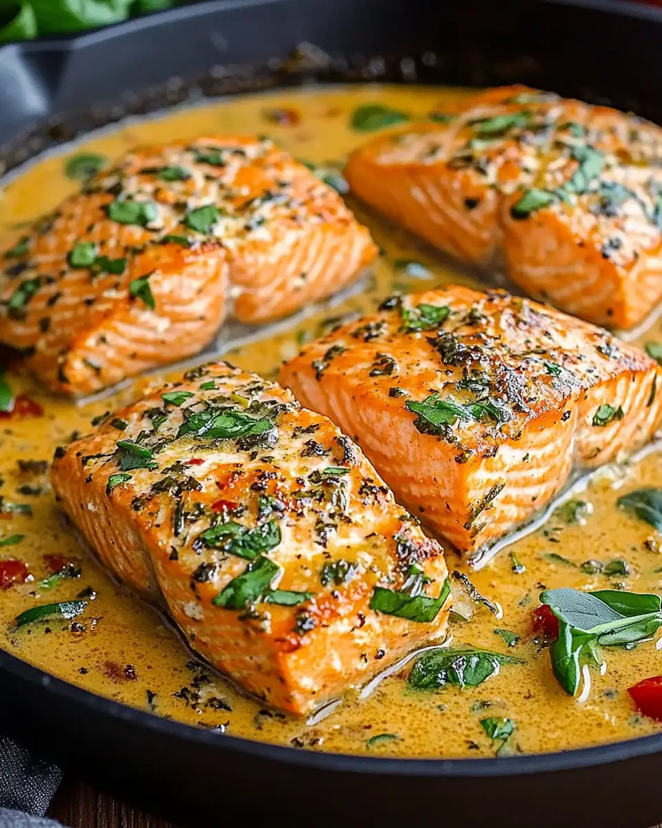 5. Combine & Finish: Add the fresh spinach and stir until wilted. Return the salmon fillets to the skillet, spoon the creamy sauce over the salmon, and let everything simmer for 2 minutes to combine the flavors.