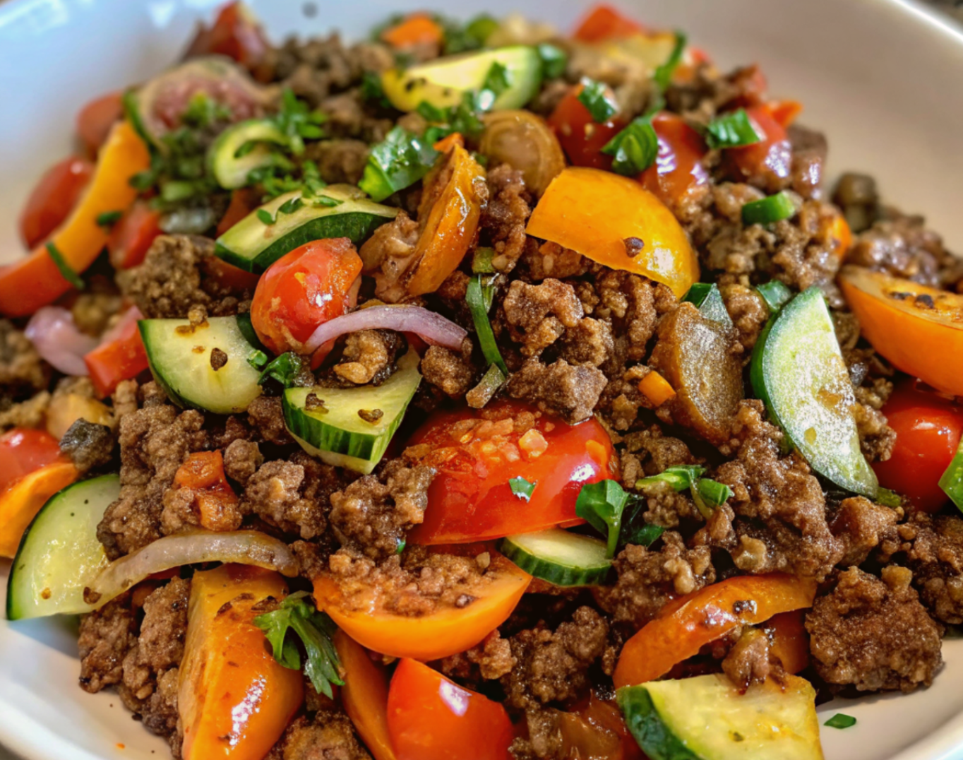 The flavor is vibrant and balanced. The beef is savory with warming spices like cumin and paprika, while the fresh lemon juice and herbs brighten everything up. You get a delicious contrast of tender beef, crunchy veggies, briny olives (if you’re into that), and creamy feta. It’s like a deconstructed gyro—fresh, bold, and seriously satisfying.
