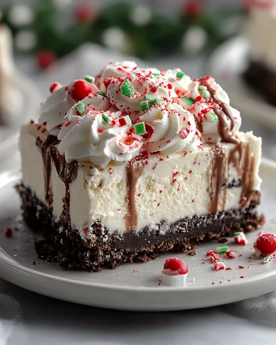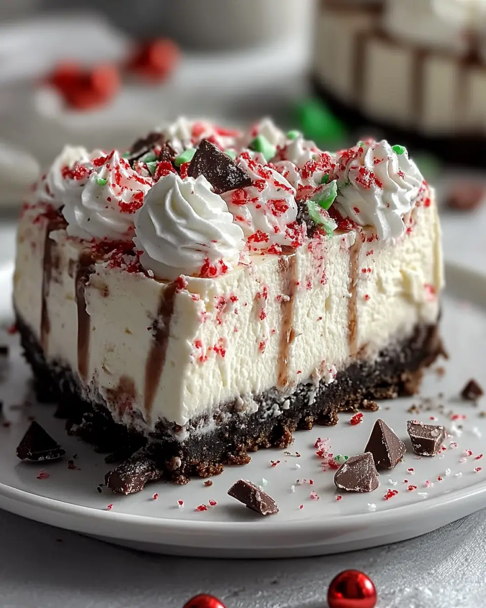 This No-bake Peppermint Cheesecake pairs beautifully with a hot cup of coffee or a festive peppermint mocha. The rich, creamy flavors of the cheesecake are complemented by the bold, robust notes of coffee, creating a balanced and satisfying end to any meal. For a complete holiday spread, consider serving it alongside other favorites like my Classic Roast Chicken or Herb-Infused Mashed Potatoes, which balance the sweetness with savory comfort. The combination of sweet and savory dishes creates a well-rounded meal that is sure to impress your guests.