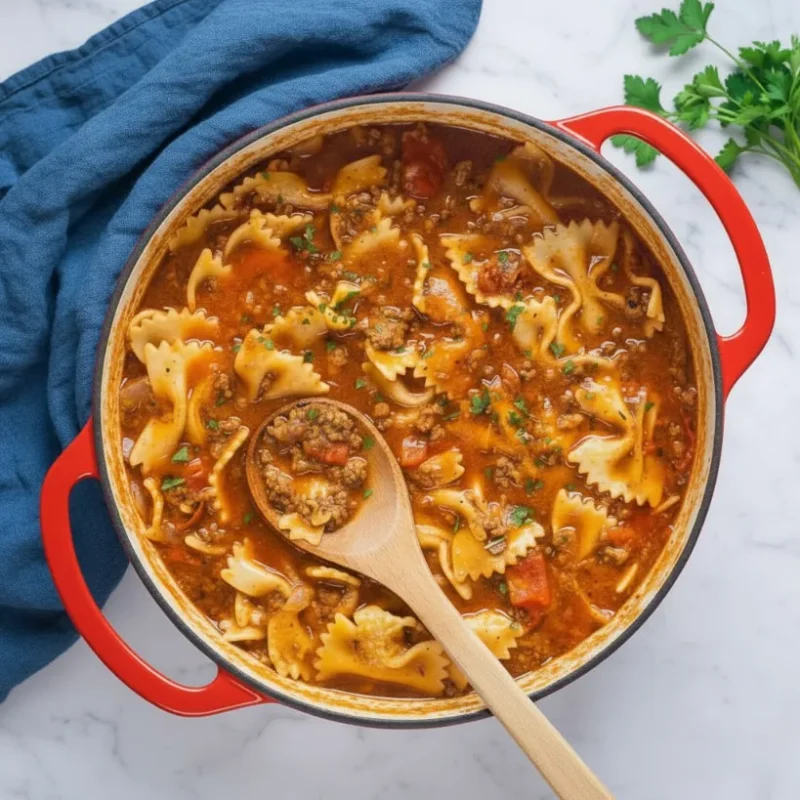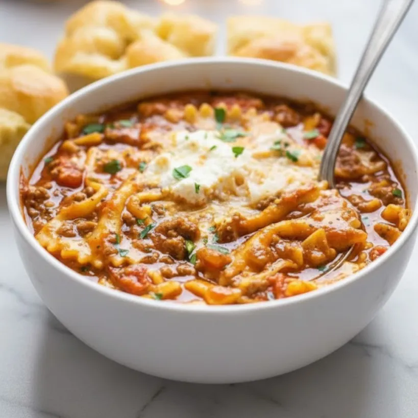 One Pot Lasagna Soup is a hearty, tomato-based soup loaded with lasagna noodles, seasoned ground beef (or sausage), ricotta, mozzarella, parmesan, and Italian herbs. It delivers all the flavors of traditional lasagna without the layering, baking, or mess — everything simmers together beautifully in one comforting pot.