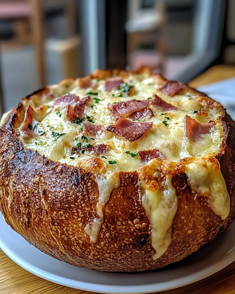 Fill the Bread Bowl: Spoon the mixture into the hollowed-out rye bread bowl, ensuring it’s evenly distributed.