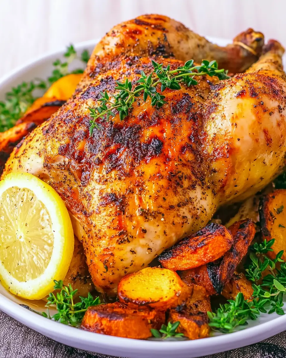 - Rest and serve: Once cooked, remove the chicken from the oven and let it rest for 10-15 minutes. Garnish with fresh herbs before carving and serving.