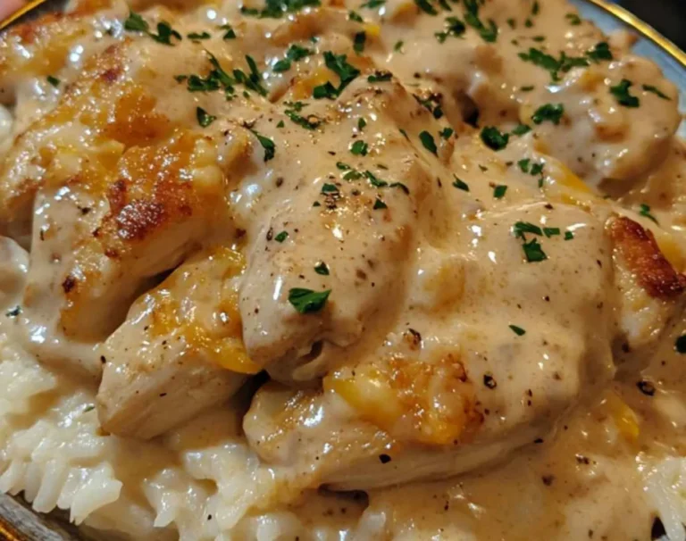 Golden, juicy chicken smothered in a silky onion-garlic cream gravy, poured over tender rice. The flavors are rich, hearty, and homey—like Southern cooking with a little extra comfort layered in.