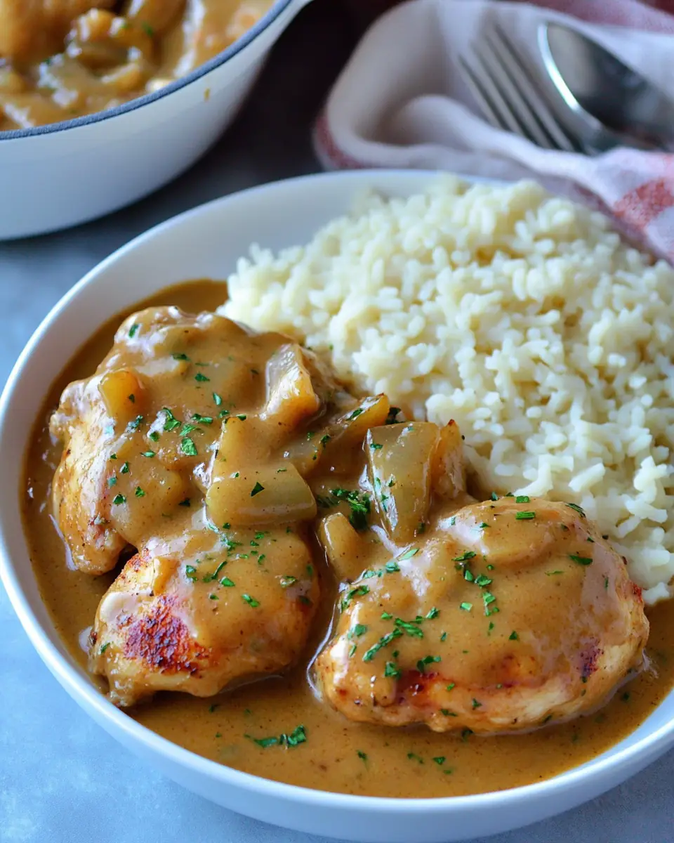 A comforting dish featuring tender chicken thighs smothered in a rich onion and pepper gravy.