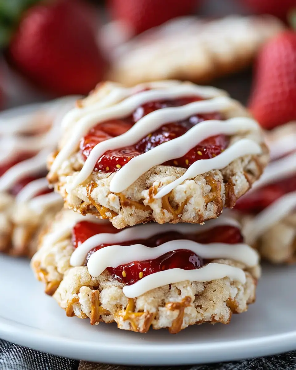 Strawberry jam is the star of these cookies, offering a burst of fruity sweetness that brings to mind the warmth of summer days. Its vibrant color and flavor are an inviting contrast to the golden cookies and creamy drizzle. Stirring the jam before use ensures a smooth, spoonable consistency for filling the cookie indentations.