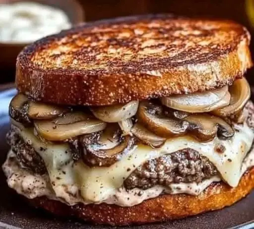 A rich and savory grilled sandwich packed with juicy beef, sautéed mushrooms, and melted Swiss cheese on crispy sourdough.