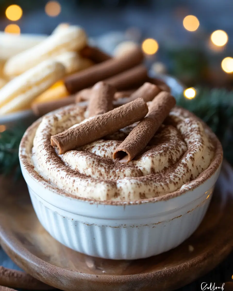 - Spoon the dip into a serving bowl, dust with additional cocoa powder if desired, and serve with ladyfingers for dipping.