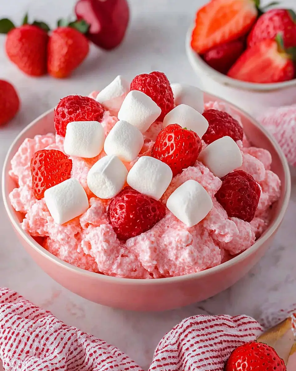 - Scoop the fluff into serving bowls or a large serving dish. Garnish with whipped cream, fresh strawberries, and a sprinkle of pink decorations for a festive finish.