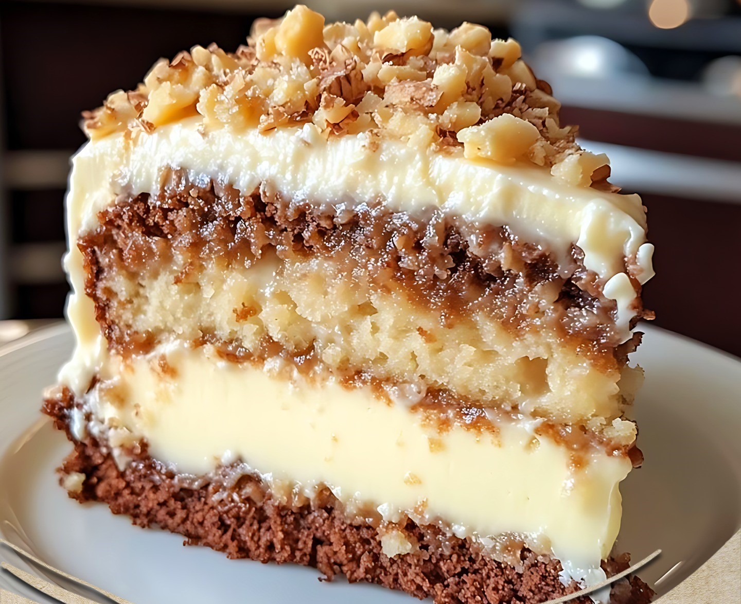 An elegant White German Chocolate Cake featuring a luscious cheesecake center, topped with a rich and creamy chocolate frosting. Perfect for special occasions!